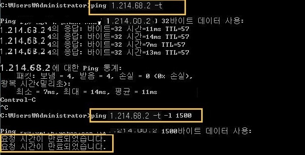 아래 그림에서 위쪽은 핑 기본 값에 -T 옵션을 붙여서 사용한 것이고 아래쪽은 -L 옵션을 붙여서 1500바이트를 전송 데이터로 설정한 것입니다.