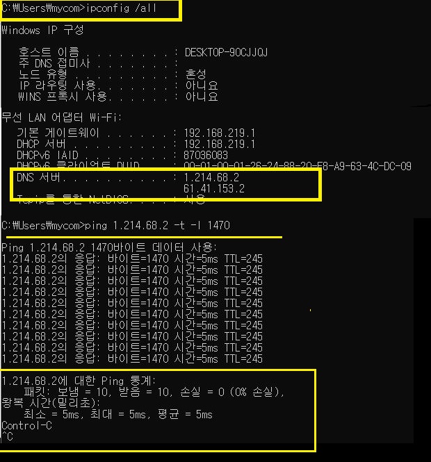 아래 그림에서 위쪽은 핑 기본 값에 -T 옵션을 붙여서 사용한 것이고 아래쪽은 -L 옵션을 붙여서 1500바이트를 전송 데이터로 설정한 것입니다.
