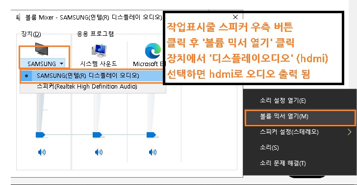 그리고 장치 탭 밑의 역삼각형 버튼을 클릭하여 '디스플레이 오디오'를 선택하면 hdmi 케이블로 오디오가 출력됩니다.