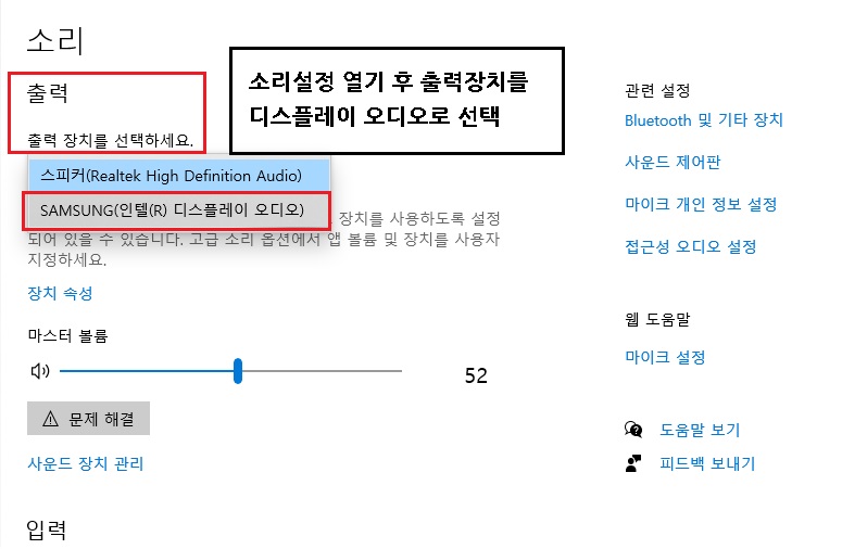또는 위 화면에서'소리 설정 열기'를 클릭한 후 아래 그림에서처럼 소리 출력 장치를 '디스플레이 오디오'로 선택하면 hdmi로 오디오가 출력 됩니다.