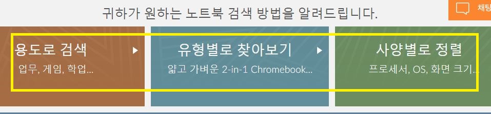바로 가기 메뉴 중에서 용도별, 유형별, 사양별 하나를 선택하여 클릭합니다. 참고로 잘 모르겠다 싶으면 그냥 용도로 검색하여 고르는 것이 가장 빠른 방법입니다.