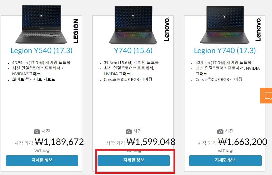 제가 게임용 노트북을 선택했더니 아래와 같은 제품들이 자동으로 선택되어 목록에 나타났습니다. 이 중에서 제품명 Y740으로 15.6인치 제품을 자세하게 알아보겠습니다.