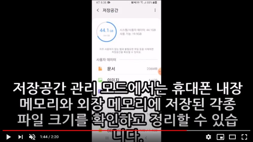 저장공간 관리 모드에서는 휴대폰 내장 메모리와 외장 메모리에 저장된 각종 파일들을 정리할 수 있습니다.