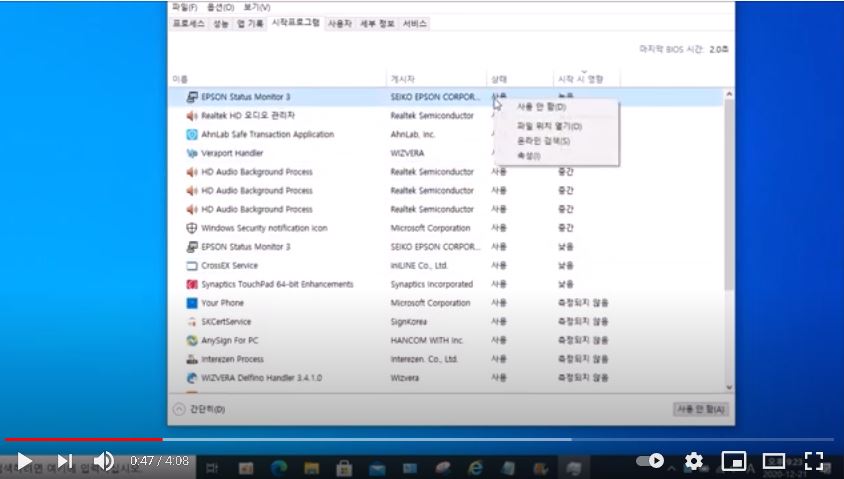 중지할 프로그램 이름에 마우스 우측 버튼을 클릭하고 "사용 안함"을 선택하면 됩니다.