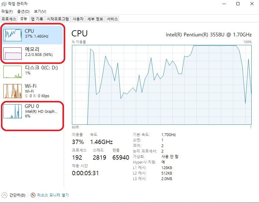 성능 탭을 클릭하면 현재 시스템 전체 자원 사용 현황을 파악할 수 있습니다.