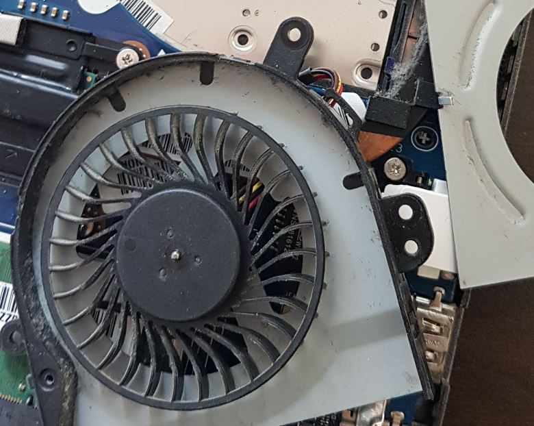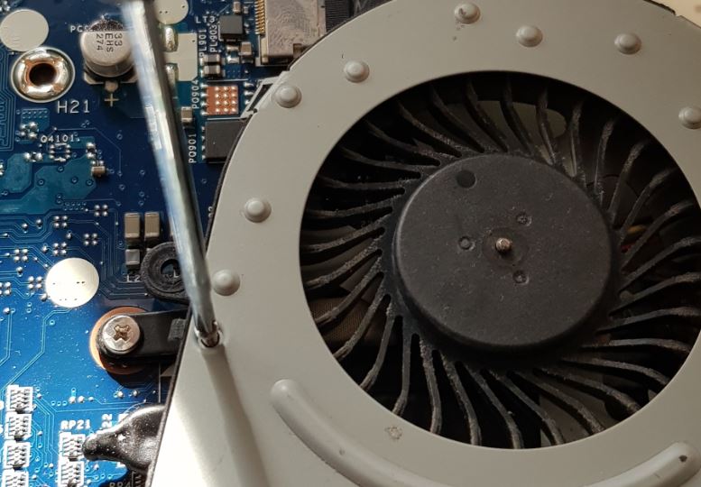노트북을 분해한 후 쿨링팬 덮개 나사를 제거한 후 먼저 팬과 통풍구에 달라붙은 먼지를 깨끗하게 제거합니다.