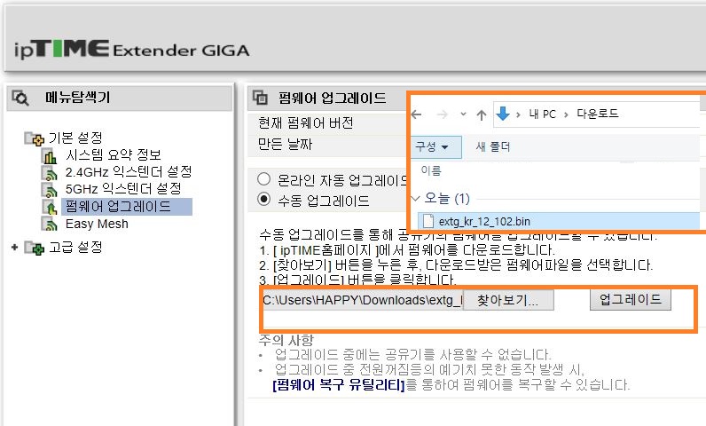 좌측 메뉴 기본 설정에서 '펌웨어 업그레이드'를 선택하여 우측 창에서 '수동 업그레이드'를 선택하고 찾아보기를 누른 후 다운 받은 펌웨어 파일을 열어서 업그레이드 버튼을 눌러주면 됩니다.