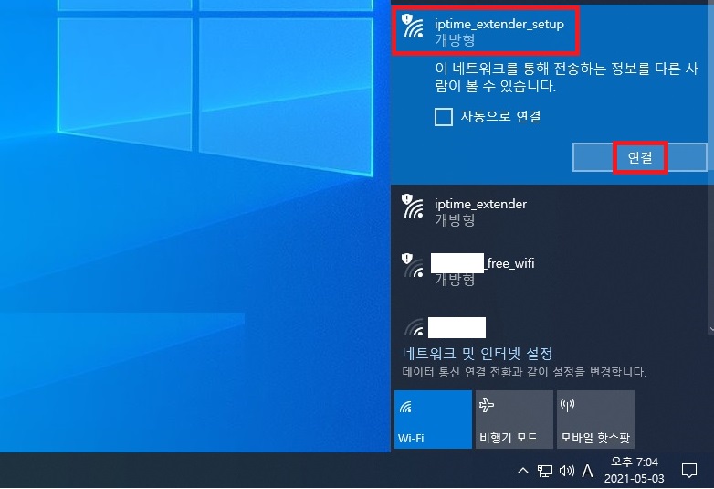 노트북이나 휴대폰에서 와이파이를 켜고 IPTIME_EXTENDER_SETUP 네트워크에 연결합니다.
