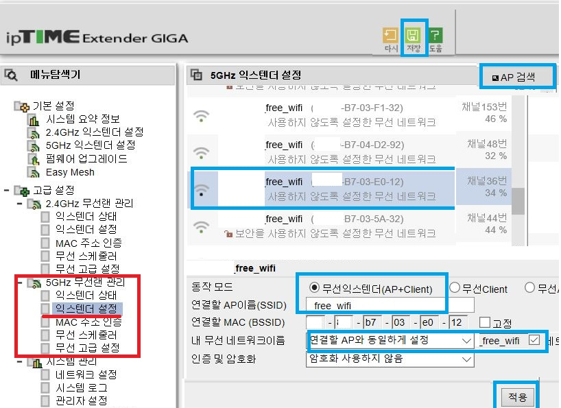 그 다음, 좌측 메뉴 하단 - 고급 설정- 5GHZ 무선랜 설정- 익스텐더 설정을 차례로 선택한 후 우측 창 상단에서 AP 검색 버튼을 눌러 줍니다. (제품을 테스트하는 장소에 공용와이파이 신호만 있어서 부득이 네트워크 이름 일부를 지웠습니다.)