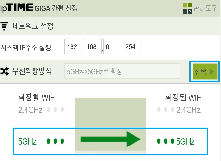 간편 설정 창이 열리면 상단 메뉴에서 '무선확장방식'을 5GHZ--▷5GHZ로 확장을 선택합니다.