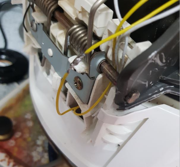 끊어진 선 한쪽이 바깥에서는 보이지 않기 때문에 할 수 없이 밥솥 뚜껑을 분해하여 선을 연결해야 합니다.