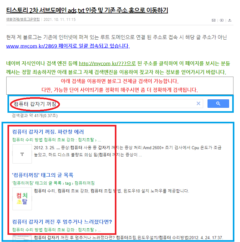 404페이지는 www.mycom.kr/2869 페이지로 자동 이동되며 아래 그림처럼 간단한 설명과 블로그 자체 검색을 통하여 사용자가 원하는 정보를 찾을 수 있게 하였습니다.