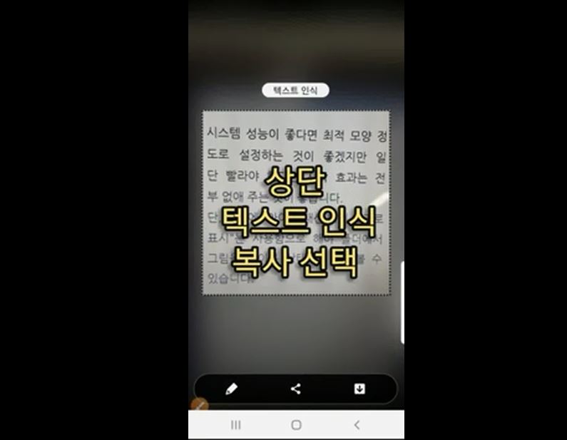 스마트셀렉터 사각형 캡처가 끝나면 상단에 '텍스트인식' 이라는 글자가 표시되는데 그 부분을 터치하면 그림 속 문자를 추출할 수 있습니다.