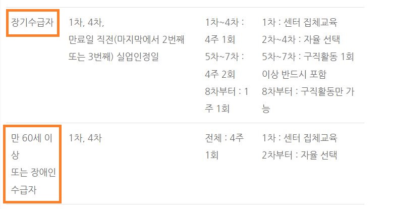 장기수급자: 5차 부터 7차 까지는 구직활동 1회 필수 포함, 재취업 8차 부터는 구직 활동만 1주에 1건 활동 필수 인정