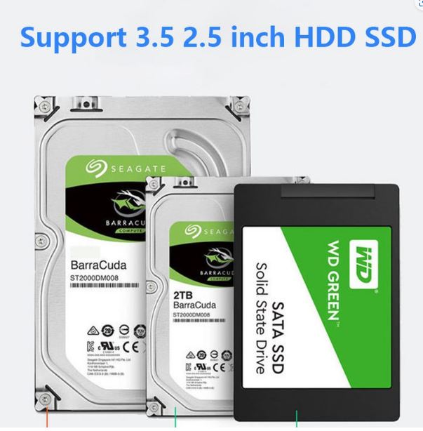 아래 사진은 외부 전원을 따로 사용하는 SATA 3.5인치 하드디스크를 연결하여 사용하는 것을 보여주고 있습니다.