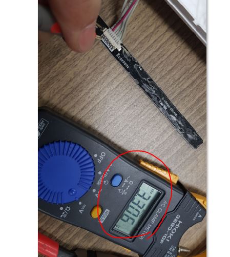 전원스위치 전원을 점검하고 있는 사진입니다. 정확히 3.3V 출력되고 있으며 전원은 정상입니다. 그런데 사진으로는 표현하지 못하지만 이 상태에서 전원스위치를 누르면 순간 전원이 0V로 변해야 하는데 스위치를 눌러도 계속 3.3V를 유지하고 있습니다. 즉, 스위치 접점이 눌러도 붙지 않고 있는 것입니다. 스위치 불량!