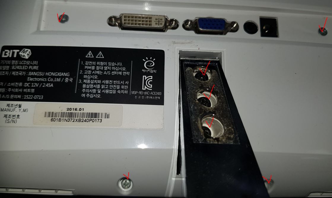 모니터 분해는 생각보다 간단합니다. 모니터 뒷면 케이스에 박힌 나사들을 전부 드라이버를 이용해 풀러 줍니다. 이 때 스티커나 고무 마개 같은 것으로 나사를 숨겨 놓은 것이 없는지 꼼꼼히 살펴야 합니다.