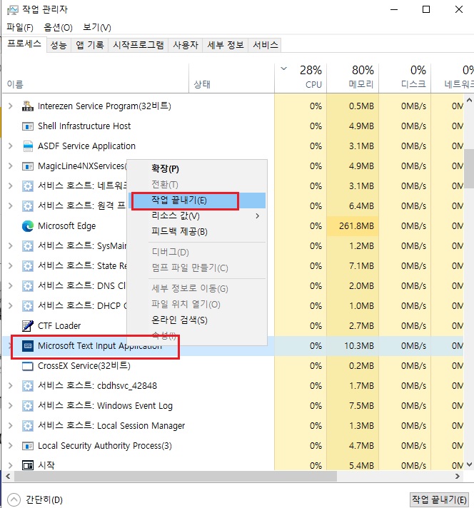 작업관리자가 실행되면 프로세스 목록에서 microsoft text input application 항목을 클릭한 후 '작업끝내기'를 선택하여 프로세스를 중지하면 문제가 해결 됩니다.