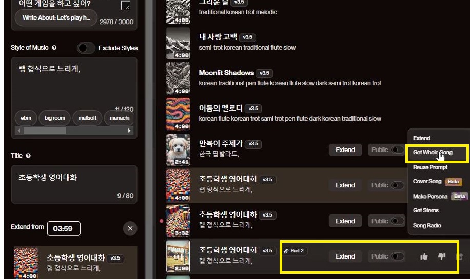 아래 그림처럼 처음에 만든 곡 목록 옵션에서 Extend 기능을 이용하여 part 2 노래가 만들어졌다면 네모에 표시된 것처럼 part 2 목록의 옵션을 클릭하여 Cteate - Get Whole Song 메뉴를 차례로 선택하면 첫 번째 노래와 두 번째 노래를 합쳐서 한 개의 곡으로 만들어 줍니다.