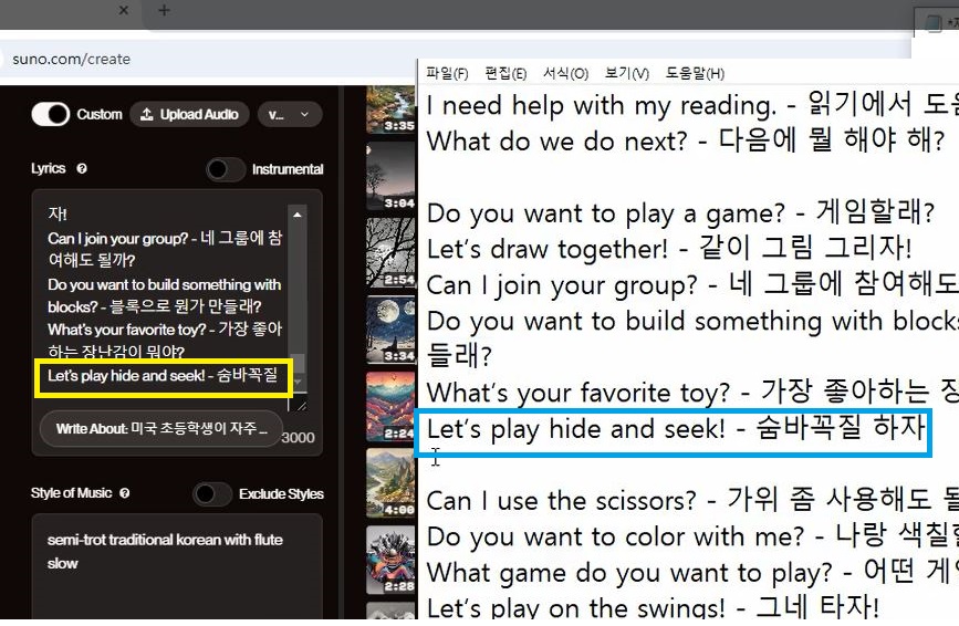 제가 원하는 가사를 전부 붙여넣기 했는데 3000자 제한에 걸려 전체 가사를 사용할 수 없는 상태입니다. 이 상태에서 제한에 걸린 가사는 버리고 그냥 음악 만들기를 시도합니다.