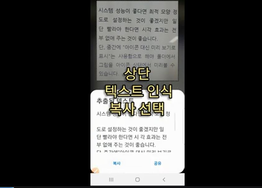 스마트셀렉터 사각형 캡처가 끝나면 상단에 '텍스트인식' 이라는 글자가 표시되는데 그 부분을 터치하면 그림 속 문자를 추출할 수 있습니다.