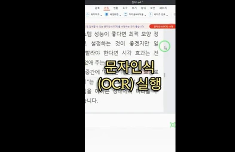 알pdf에서 그림 파일을 불러온 후 상단 메뉴 중에서 문자인식(OCR)을 실행합니다. (pdf 파일로 먼저 저장할 것인지 물어오면 저장 또는 아니오 둘 다 상관 없습니다.)