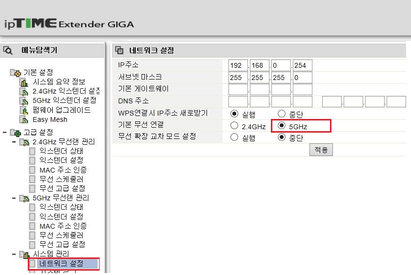관리자 창이 열리면 맨 처음으로 좌측 메뉴 하단에서 시스템관리 - 네트워크 설정을 선택하고 우측 창에서 '기본 무선 연결'을 5GHZ로 선택하고 '적용'을 눌러 줍니다. (경험 상 5GHZ로 선택했을 때 끊김이 덜 하고 속도도 빠른 것 같습니다.)