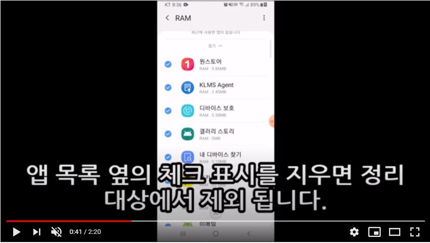 만약, 특정 앱들만 종료하고 싶을 때는 아래 메뉴에서 "RAM"을 선택하여 창이 열리면 옆의 선택란 체크를 지워주면 해당 앱은 종료되지 않습니다.