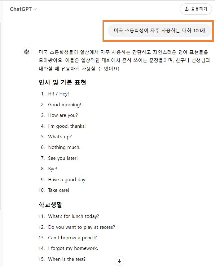 먼저 ChatGTP 를 이용해서 "미국 초등학생이 자주 사용하는 대화 100개"를 요청하였습니다.